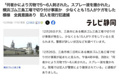 1 : 12月26日、三島市南二日町にある横浜ゴム三島工場で切り付け事案が起きたと見られ、午後4時半頃、消防に「何者かにより刃物で5~6人刺された。スプレー液を撒かれた。現場では犯人が警察により確保されている」と通報がありました。 富士山南東消防本部 三島消防署によりますと、少なくとも14人がケガをしていて、このうち6人については刃物で刺されたような傷が確認されていますが、いずれも意識はあるということです。 事件は工場の敷地内で起きていることから、ケガをしたのはいずれも工場の関係者の可能性が高いということです。 警察はすでに犯人を現行犯逮捕していて、事件発生時の状況などを調べています。 4 : 年末最終日だと言うのに人生最終日とは…