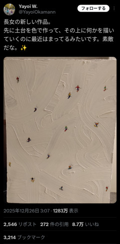 1: 2025/12/27(土) 00:47:20.72 昨日ポストした長女の作品がバスってる。どうやら有名アーティストさんの作品を模写していたみたいで、その事についての批判も頂いた。娘が既にアーティストなら問題ありだと思うけど、13歳の娘が色々な手法を試しているのは良いのでは。それとも消すべきなのか。🤔— Yayoi W. (@YayoiOkamann) December 26, 2025 ※関連記事 【画像】この漫画の「ダメ人間」と付き合っている彼女の話、少し怖くて草wwwww…