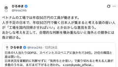 1:muffin ★ 2025/12/25(木) 19:40:02.82 ID:KTBBTszb9 「ひろゆき」こと実業家の西村博之さんが25日までにX(旧ツイッター)を連続更新し、日本の1人当たり名目国内総生産(GDP)が凋落(ちょうらく)の一途をたどっている状況に、もの申した。 共同通信によると、内閣府は23日、2024年の日本の1人当たり名目GDPはドル換算で3万3785ドルで、経済協力開発機構(OECD)加盟38カ国中24位で、過去最低だった23年の22位からさらに2つ順位を下げたと発表した。少子高齢化や慢性的な低成長に加え、為替相場の円安進行が要因という。 ひろゆきさんは24日…続きはソース元で ベトナムの工場では年収50万円の工員が働きます。人手不足の日本で、年収50万円で働く日本人が集まると考える頭の弱い人が「工場を国内回帰させればいい」とかおかしな意見を言う。おかしな考えを正して、合理的な判断を積み重ねないと海外との競争には負け続ける。 — ひろゆき (@hirox246) December 25, 2025…