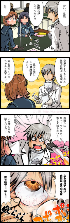 えのげ :【動画】沸騰石を入れずに試験管で水を沸騰させると…こうなる😨』 Breaking Mad 折田非常勤シリーズ 中学生が下級生にお菓子と偽って水酸化ナトリウムを食べさせて搬送 人体の成分(水分何%、タンパク質何%など)を調べる実験 瞬間接着剤は布などに染み込むと反応が早くなり高温を発します…