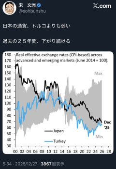 1: ガンシクロビル(茸) [GB] 2025/12/27(土) 09:24:18.43 ID:Mf3Yk+rH0 BE:271912485-2BP(2000) sssp://img.5ch.net/ico/nida.gif ソース 26日の東京外国為替市場、円相場は、日銀による早期の追加利上げの観測が後退したことなどから、値下がりしました 引用元: ・ スポンサーリンク スポンサーリンク 10: ネビラピン(みかか) [NL] 2025/12/27(土) 09:30:21.05 ID:rHSYYLhl0 >>1 日銀の金融緩和は、高齢化と民主党(国民民主党・立憲民主党)政権の失政で弱った現役世代の消費を支えるためのものだよ。 いまだに高齢化によるデフレで、民主党政権によって壊された輸出産業が復活していない現状で 金融緩和を止め金利を上げても、現役世代の消費が少なくなって不況になるだけ。 いま必要なのは、高齢化によるデフレ退治であって、金利を上げて現役世代の需要を削ることじゃないんだよね。 いま日本が金利を上げられなくて円安なのは、民主党(国民民主党・立憲民主党)の失政の置き土産だよ。 12: ネビラピン(みかか) [NL] 2025/12/27(土) 09:31:05.59 ID:rHSYYLhl0 >>1 日本の実質賃金が上がらないのは、社会保障(税)に生活を依存する人が増えたから。 年金生活者や生活保護のような、社会保障に頼り経済活動によって所得が増えない人にお金を配っても、 そのお金の効果を最大化しようとしてより安い商品を購入する。 そしてその需要に応えようとする商社が第三国からより安い代替品を輸入し、 日本市場がより安い物品で満たされていく。 内需向けの製造業は原材料の輸入物価の上昇を従業員の給料を抑えることで 社会保障にぶら下がる人の需要に対応してしまう。 日本が実質賃金を上げるには、80歳未満の年金や生活保護費を削減して、 健康寿命が伸びて働けるのに働かない人たちを働かせるしかないよ。 13: ネビラピン(みかか) [NL] 2025/12/27(土) 09:31:29.64 ID:rHSYYLhl0 >>1 金利は30年前の水準に戻ったのに、為替は155円のままだよ。 国民民主党が主張するような国債頼みの減税や補助金や給付金は、円の信用が失われて円安になるだけで 円安の分さらに輸入物価は上がり(原材料費は上がり)賃金の上昇よりも物価の上昇の方が強いことに変わりはないよ。 国債を使って減税してもいま以上の円安になって物価高対策にはならないんだよね。 国債を使う分、無駄に借金を積み増して、子どもたちの未来に利子をつけて債務を押し付けるだけで。 財源なき減税は別の増税をまねくだけで、円安で物価高になって国民負担は増やすだけだよ。 23: ドルテグラビルナトリウム(東京都) [US] 2025/12/27(土) 09:39:49.53 ID:yPq0Catt0 >>1 先進国で通貨安政策とったのは、安倍とトルコのエルドアンだけ。 何度も言われてるがその通りの結果なんだよ この二国だけがダントツに停滞した 37: ジドブジン(庭) [GB] 2025/12/27(土) 09:49:32.16 ID:Nwql/KPc0 >>1 投資家だけど全く問題ありません メットライフのドル建て保険がオススメ 38: ビダラビン(ジパング) [KR] 2025/12/27(土) 09:49:43.76 ID:3Q9bna300 >>1 没落国家で貧困化する国民である以上、円安傾向は変わらない(笑) その状況下で金利上げるという馬鹿やりだす(笑) 金利上げれば円高になる?(笑) そう主張していた経済オンチな人達は どこに行ったのかな?(笑) 川に入って水棲生物にでもなったのだったら良いんだけどな(・∀・) 52: ビクテグラビルナトリウム(ジパング) [ニダ] 2025/12/27(土) 09:56:47.16 ID:J/Xwi0pC0 >>1 左派ク乙 高橋先生・三橋先生・藤井先生・森永先生こそ心理だから 3: ガンシクロビル(茸) [GB] 2025/12/27(土) 09:24:37.17 ID:Mf3Yk+rH0 BE:271912485-2BP(2000) sssp://img.5ch.net/ico/nida.gif な?これが現実w 8: ドルテグラビルナトリウム(ジパング) [ヌコ] 2025/12/27(土) 09:26:20.08 ID:Dk8G5LH80 基軸通貨外されて10年で落ちも落ちたな 9: リトナビル(ジパング) [ニダ] 2025/12/27(土) 09:30:05.69 ID:taUvg3fg0 これが安倍某が夢見た世界 14: エムトリシタビン(茸) [JP] 2025/12/27(土) 09:31:31.20 ID:+sI6HZ8m0 失われた30年とリンクするんだよ 日本経済への魅力低下=政府投資の削減 小泉竹中が路線づけたね 47: ピマリシン(奈良県) [JP] 2025/12/27(土) 09:54:39.68 ID:TT1mocDp0 >>14 ちょうど公明と連立組んだ時期と合致するんだっけか 51: ソリブジン(庭) [IN] 2025/12/27(土) 09:55:56.66 ID:RSVttb/o0 >>47 細川、小泉の仕掛け 民主、岸田、石破の仕上げ 17: 名無しさん@涙目です。(愛媛県) [KR] 2025/12/27(土) 09:33:09.50 ID:5h1iFDz/0 クルドは帰った方がよくね? 18: イドクスウリジン(茸) [US] 2025/12/27(土) 09:34:34.00 ID:YO+jfaBZ0 近隣窮乏化で中国が焦ってるね 20: パリビズマブ(やわらか銀行) [KW] 2025/12/27(土) 09:37:21.81 ID:Ooj8ux0F0 イクタリラよりかは強いからだいしあ 21: コビシスタット(大阪府) [US] 2025/12/27(土) 09:38:26.29 ID:4Ik/xBUM0 トルコじゃなく トゥルキエ、な 22: アバカビル(庭) [US] 2025/12/27(土) 09:39:19.62 ID:jIIgSpGT0 通貨危機来るんじゃねーのw 27: ガンシクロビル(やわらか銀行) [US] 2025/12/27(土) 09:42:12.83 ID:0g6e8Qru0 やったー円安継続だー 28: マラビロク(やわらか銀行) [ニダ] 2025/12/27(土) 09:43:15.84 ID:CJ8up2kp0 来年以降が楽しみだ イジェミョンが高市に土下座しにくるから もしかしたら竹島返ってくる