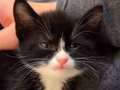 子猫の背中を撫でる飼い主さん。 にゃーん、にゃ・・・ バッテリー切れの子猫ちゃんは こんな感じ……