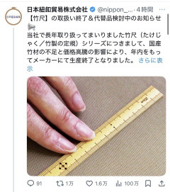 1:それでも動く名無し:2025/12/28(日) 00:18:25.78 ID:+ad9+sKT0 【竹尺】の取扱い終了&代替品検討中のお知らせ📢当社で長年取り扱ってまいりました竹尺(たけじゃく/竹製の定規)シリーズにつきまして、国産竹材の不足と価格高騰の影響により、年内をもってメーカーにて生産終了となりました。… pic.twitter.com/K8LN7pYePE— 日本紐釦貿易株式会社 (@nippon_chuko) December 27, 2025 2:それでも動く名無し:2025/12/28(日) 00:19:44.52 ID:sEBe1o0y0 爪切れや 3:それでも動く名無し:2025/12/28(日) 00:20:15.22 ID:WhEHOODY0 あき竹城さん…🥺…