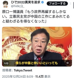 1 名前:名無しさん@涙目です。[sage] 投稿日:2025/12/24(水) 19:41:26.19 ID:135606ZA0 原口一博議員「もう政界再編するしかない。立憲民主党が中国の工作にまみれてると疑わざるを得なくなった」pic.twitter.com/HBM1MkAMae— ひで2022真実を追求 (@hide_Q_) December 23, 2025 2 名前:名無しさん@涙目です。[sage] 投稿日:2025/12/24(水) 19:41:50.95 ID:LOs7FELf0 覚醒継続w 346 名前:名無しさん@涙目です。[] 投稿日:2025/12/25(木) 03:42:51.02 ID:N17XNcjd0 >>1 ホンマに覚醒してる。傑作だわ 3 名前:名無しさん@涙目です。[] 投稿日:2025/12/24(水) 19:41:57.05 ID:iNxjSdRQ0 これは光の戦士 270 名前:名無しさん@涙目です。[] 投稿日:2025/12/24(水) 23:01:09.99 ID:yotn0DGA0 >>1 国防のことに関するかぎり立憲にこの人が居て良かったと思うわ 13 名前:名無しさん@涙目です。[sage] 投稿日:2025/12/24(水) 19:44:15.78 ID:puLH4Om30 原口さんは立憲の多数派を占める反日売国奴ではなくて電波系だから方向性が間違っていなければ良い働きをする 18 名前:名無しさん@涙目です。[] 投稿日:2025/12/24(水) 19:45:50.72 ID:HPaSA5HP0 >>13 ただ仲間にするのは不安あるのよね原口先生 331 名前:名無しさん@涙目です。[sage] 投稿日:2025/12/25(木) 02:14:51.11 ID:mnNDpKfV0 >>18 GoogleMAPとかな 64 名前:名無しさん@涙目です。[] 投稿日:2025/12/24(水) 19:53:32.74 ID:Y++692w30 >>18 反ワクチン・ディープステート・ケムトレイル論者だから仲間にしたら痛い目を見るよ まだWIFI盗聴とか集団ストーカーとかの域には到達してないみたいだが 339 名前:名無しさん@涙目です。[sage] 投稿日:2025/12/25(木) 02:45:24.87 ID:2FZTCJlV0 >>64 なかなかすげえ…逸材だな 48 名前:名無しさん@涙目です。[] 投稿日:2025/12/24(水) 19:50:51.48 ID:8sQEWVKj0 進次郎も太郎も原口さんも外交安全保障に関してはマジメに国益を考えてるんだよな 内政は色々違いがあるだろうけど 111 名前:名無しさん@涙目です。[] 投稿日:2025/12/24(水) 20:03:25.95 ID:dZI/E+/Y0 まあヤバいのは岡田よ 中国様の許可はもらったんですか! って国会で質問してたシーンが忘れられん 306 名前:名無しさん@涙目です。[sage] 投稿日:2025/12/25(木) 00:44:29.74 ID:bn/7yHDv0 岡田の「もっと国民コントロールする」発言がヤヴァすぎる 370 名前:名無しさん@涙目です。[sage] 投稿日:2025/12/25(木) 05:36:54.03 ID:A89Flc6y0 中国共産党中央対外連絡部と岡田氏の関係が問題視されています 420 名前:名無しさん@涙目です。[] 投稿日:2025/12/25(木) 09:08:37.10 ID:FU9E/Ca70 原口の思想て立憲というより日本保守寄りの考えじゃね さっさと離党すればいいのにな 422 名前:名無しさん@涙目です。[sage] 投稿日:2025/12/25(木) 09:27:39.35 ID:EOlomQMm0 >>420 対中は日本保守党 反ワクは参政党 政治スタンスは松下政経塾というキメラだから 421 名前:名無しさん@涙目です。[] 投稿日:2025/12/25(木) 09:17:04.55 ID:y65A07k20 >>420 そうなんだよ なんで立憲みたいな気持ち悪い党にしがみついてるのか不思議だったんだよ ただ核とかあの辺の話になると左寄りになるけど 432 名前:名無しさん@涙目です。[] 投稿日:2025/12/25(木) 11:53:58.85 ID:jSjCn2cV0 >>420 立憲民主党と国民民主党の源流である旧民主党って、本来はアメリカ寄り、イギリス寄りの親英米路線だったよ だから今みたいな中国共産党の工作機関の面々と党幹部らが会って共同歩調で動くような中国側の政党ではなかった まあ公明党・創価学会と組んだあたりで、おかしいとは感じていたけどね 時期的には更にその前に、AV新法を作ったあたりから、社民党化しているような違和感があったから、あの頃には既に侵食されて、乗っ取られていたんだろうな 33 名前:名無しさん@涙目です。[sage] 投稿日:2025/12/24(水) 19:48:06.65 ID:F2qVQ7sU0 こいつ謎に選挙強いし嫁さん亡くしたし死線も超えたしで無敵になってんだよな 66 名前:名無しさん@涙目です。[] 投稿日:2025/12/24(水) 19:53:41.09 ID:gjqkeFMr0 原口の場合元々の知名度や大臣経験があって嫁が結構前に亡くなったり大病になったりの田舎佐賀選挙区だから離党しても大丈夫そうだもんな 91 名前:名無しさん@涙目です。[] 投稿日:2025/12/24(水) 19:58:24.22 ID:b0ghiTTK0 高市が総理大臣になっただけで覚醒する人が出てきたり本性を表す人が出てきたりしてなんか怖い 429 名前:名無しさん@涙目です。[] 投稿日:2025/12/25(木) 11:40:02.52 ID:iE1VB1CV0 >>91 公明が連立離脱してくれたからな ありがたや 98 名前:名無しさん@涙目です。[sage] 投稿日:2025/12/24(水) 19:59:25.26 ID:HJ6KEb5T0 根っからのパヨクと、国民の世論がパヨってたからパヨクやってたファッションパヨクに分かれてきてるんだろうな ファッションパヨクは国民世論がウヨ化してきたの見て、変節する機会を伺いだしてるんだろう 318 名前:名無しさん@涙目です。[] 投稿日:2025/12/25(木) 01:19:18.53 ID:7eAsi2zk0 >>98 最近モナ男が大人しいけど桜井や長島とか自民に移って生き生きしてる 211 名前:名無しさん@涙目です。[] 投稿日:2025/12/24(水) 21:17:16.73 ID:w4ctGRV40 なんか露骨すぎてな 立憲が想定外に反感買いまくってるから 「まともな奴もいます」なポーズ取ってるだけに見える 226 名前:名無しさん@涙目です。[] 投稿日:2025/12/24(水) 21:36:09.67