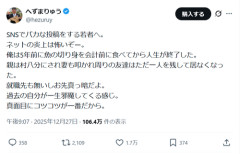 1: 2025/12/28(日) 14:26:33.74 元迷惑系YouTuberで、奈良市議のへずまりゅう氏が27日、X(旧ツイッター)を更新。SNSへの不適切投稿が続く現状についてつづった。 「SNSでバカな投稿をする若者へ」と書き出したへずまりゅう氏は「ネットの炎上は怖いぞー」と自らの体験を踏まえるように記述。「俺は5年前に魚の切り身を会計前に食べてから人生が終了した。親は村八分にされ妻も叩かれ周りの友達はただ一人を残して居なくなった。就職先も無いしお先真っ暗だよ」とし、「過去の自分が一生邪魔してくる感じ。真面目にコツコツが一番だから」と呼びかけた。さらに「自分にできることは過去の失敗を反面教師として発信することです。一人でもバカな真似をする人が減りますように」と願った。 SNSでバカな投稿をする若者へ。ネットの炎上は怖いぞー。俺は5年前に魚の切り身を会計前に食べてから人生が終了した。親は村八分にされ妻も叩かれ周りの友達はただ一人を残して居なくなった。就職先も無いしお先真っ暗だよ。過去の自分が一生邪魔してくる感じ。真面目にコツコツが一番だから。— へずまりゅう (@hezuruy) December 27, 2025 ※関連記事 【画像】この漫画の「ダメ人間」と付き合っている彼女の話、少し怖くて草wwwww…