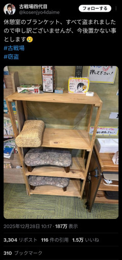 1: 2025/12/28(日) 21:49:26.99 休憩室のブランケット、すべて盗まれましたので申し訳ございませんが、今後置かない事とします😢#古戦場#窃盗 pic.twitter.com/qTQaSfz8Sm— 古戦場四代目 (@kosenjyo4daime) December 28, 2025 ※関連記事 【画像】この漫画の「ダメ人間」と付き合っている彼女の話、少し怖くて草wwwww…