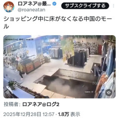 1: ベスティーちゃん(東京都) [TW] 2025/12/28(日) 21:12:14.60 ID:eI3hu4oP0● BE:662593167-2BP(2000) sssp://img.5ch.net/ico/taxi.gif 引用元: ・ スポンサーリンク スポンサーリンク 2: ごきゅ?(ジパング) [UY] 2025/12/28(日) 21:12:42.36 ID:hyHpF2M+0 はい 4: ベスティーちゃん(東京都) [TW] 2025/12/28(日) 21:12:47.83 ID:eI3hu4oP0 BE:662593167-2BP(1000) sssp://img.5ch.net/ico/taxi.gif 20: ブラックモンスター(茸) [US] 2025/12/28(日) 21:17:33.61 ID:QHbTpIMv0 >>4 倒れたマネキンが「ふぅー助かった」ってやってるように見える 51: マウンちゃん(茸) [US] 2025/12/28(日) 21:33:28.23 ID:Rrb8Bev/0 >>4 なんで下の階真っ暗なの? 6: V V-PANDA(東京都) [US] 2025/12/28(日) 21:13:42.37 ID:/fkMvT6O0 オッサン消えた 8: ブラックモンスター(茸) [US] 2025/12/28(日) 21:13:56.41 ID:QHbTpIMv0 ショッキング 9: シャリシャリ君(ジパング) [EU] 2025/12/28(日) 21:14:11.77 ID:rtESsLEx0 まあしにはするけどそれだけでしょ 10: ハッチー(東京都) [ニダ] 2025/12/28(日) 21:14:48.50 ID:K3QJh/F/0 日常 12: キャティ(ジパング) [ニダ] 2025/12/28(日) 21:15:17.24 ID:LJI1sPLx0 トラップカード オープン 13: 黄色いゾウ(庭) [ヌコ] 2025/12/28(日) 21:16:12.01 ID:TnTR7vie0 助かってればいいが 14: カッパ(ジパング) [US] 2025/12/28(日) 21:16:20.48 ID:QCqcNEm20 おもろ中国 15: こんせんくん(大阪府) [VN] 2025/12/28(日) 21:16:28.65 ID:fA06LSVP0 意味が分からんのだが 16: まりもっこり(東京都) [JP] 2025/12/28(日) 21:16:51.67 ID:+ObekjXo0 いつもの中国だろ 17: だっこちゃん(みかか) [ヌコ] 2025/12/28(日) 21:16:54.40 ID:xyNoL/zW0 ちょっとしたイリュージョンアル 18: さんてつくん(やわらか銀行) [ZA] 2025/12/28(日) 21:17:14.49 ID:12SKrPGY0 えまって。日本もいずれこうなるの?? 19: 名無しさん@涙目です。(庭) [US] 2025/12/28(日) 21:17:29.45 ID:c/oR6BuP0 お相撲さんクラスの巨漢が運悪く一箇所に集まってしまった可能性も 21: ガリガリ君(庭) [CH] 2025/12/28(日) 21:18:09.87 ID:EfHDkzUn0 おっさんが消えるイリュージョン 25: どんぎつね(東京都) [US] 2025/12/28(日) 21:20:04.58 ID:jTtJytPY0 マネキンの神回避 26: あかりちゃん(やわらか銀行) [CN] 2025/12/28(日) 21:20:12.99 ID:nV/5kxtP0 日本も陥没起きまくるぞ 29: こんせんくん(大阪府) [VN] 2025/12/28(日) 21:20:56.97 ID:fA06LSVP0 動画見たら床が抜けてるやん でも落ちても50センチくらいだろ 43: こうふくろうず(庭) [US] 2025/12/28(日) 21:30:28.41 ID:nF0GAI2q0 >>29 どう見ても数メートルは落下してる 下手したら下の階も床抜けてんじゃね? 30: おれんじーず(愛知県) [US] 2025/12/28(日) 21:21:03.69 ID:G/KLLvcV0 震度0 31: パーシちゃん(愛知県) [US] 2025/12/28(日) 21:21:11.76 ID:VNR3F6b+0 よくある日常 32: ケンミン坊や(石川県) [KZ] 2025/12/28(日) 21:21:13.69 ID:0rpzEKG40 細かすぎて伝わらないモノマネ選手権でもやっていたのか 34: うずぴー(庭) [US] 2025/12/28(日) 21:21:55.26 ID:MxX8h5lc0 ドッキリかな? 35: ホッピー(北海道) [PE] 2025/12/28(日) 21:22:43.83 ID:NFVmZkES0 フォールガイズやってたんでしょ 38: 吉ギュー(SB-Android) [JP] 2025/12/28(日) 21:24:58.05 ID:0nhZg68V0 なんか見たことあるなぁと思ったら去年に見たやつだった 39: UFOガール ヤキソバニー(東京都) [OM] 2025/12/28(日) 21:26:28.86 ID:0cIr5m9l0 いざ戦争してみたらチャイナ製兵器も使い物にならんのだろうな 41: ↑この人痴漢です(ジパング) [RW] 2025/12/28(日) 21:28:26.27 ID:Cd9p31vL0 >>39 人も真っ先に逃げだすから使い物にならんぞ 45: あかりちゃん(千葉県) [VN] 2025/12/28(日) 21:30:50.50 ID:Zhpu3DpD0 >>39 ガタひどくて耐久性ないよ 削り出す母材の質が悪過ぎて輸入に頼っているよ いくらか使ったら暴発する 40: 暴君ベビネロ(福岡県) [ZM] 2025/12/28(日) 21:27:15.97 ID:AhmAw56Z0 マネキンが助かってどうする 42: モバにゃぁ?(みかか) [US] 2025/12/28(日) 21:29:55.14 ID:2yLdu0a/0 韓国の三豊百貨店なんか営業中のビルごと崩壊だぞwwww 44: てん太くん(みょ) [PT] 2025/12/28(日) 21:30:40.77 ID:CfEyD67f0 落ちた人はもちろん、下の階にいた人はどうなったんだろうな。 46: マーキュリー(庭) [GB] 2025/12/28(日) 21:30:58.92 ID:ogoSjaGk0 AIだろ 47: レインボーファミリー(ジパング) [EU] 2025/12/28(日) 21:31:14.61 ID:ByoG8mSd0 跳ねた女性の足元も危なかったな人がゴミの国だから一匹や二匹どうでもいいだろけど 48: サンペくん(福島県) [US] 2025/12/28(日) 21:31:49.05 ID:ClpLwFY+0 ドラクエのダンジョンでよくあるやつだろ 49: おばあちゃん(千葉県) [US] 2025/12/28(日) 21:32:27.20 ID:UZs0ADLa0 これがリアル落とし穴か 50: ぶんぶん(北海道) [LY] 2025/12/28(日) 21:33:03.74 ID:Y1rjYNVx0 プーさんに逆らうとこうやって事故処理されるのか 52: こうふくろうず(埼玉県) [EU] 2025/12/28(日) 21:35:38.11 ID:KD19K0uJ0 テッテレー!って音と共にドッキリ大成功の看板出せば問題ない…