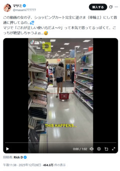 1: 2025/12/29(月) 11:18:44.82 この動画の女の子、ショッピングカート完全に逆さま(車輪上)にして普通に押してるの…💦 マジで「これが正しい使い方だよ〜♡」って本気で思ってるっぽくて、こっちが絶望しちゃうよぉ…😅 pic.twitter.com/ARTdGJQURx— マサミ (@masami777777) December 28, 2025 ※関連記事 【画像】この漫画の「ダメ人間」と付き合っている彼女の話、少し怖くて草wwwww…