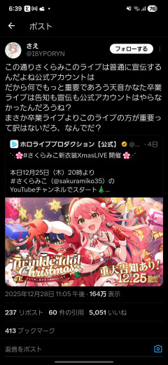 引用元: 1182: Vtuberまとめ 2025/12/29(月) 18:41:15.04 ID:gYCMKYS4 ホロのファン、結構やはいな このツイートで5000いいねつくんか こんなんたまたまとかだろ?🤔 1189: Vtuberまとめ 2025/12/29(月) 18:41:49.11 ID:ojzaFpHm >>1182 ヤバいのは運営では… 1197: Vtuberまとめ 2025/12/29(月) 18:42:27.67 ID:ymTa6yyA >>1182 公式のアカウントがたまたまなはずないだろ サイコロ振って告知対象決めてんのか?w 1203: Vtuberまとめ 2025/12/29(月) 18:42:59.51 ID:gYCMKYS4 >>1189 あんま詳しくないけど、毎回ってわけじゃなくない? こじつけなんかと見たけど 1213: Vtuberまとめ 2025/12/29(月) 18:43:26.31 ID:31RWijDk >>1182 偶然だよ🤗 1230: Vtuberまとめ 2025/12/29(月) 18:44:22.00 ID:gYCMKYS4 >>1197 たまたまじゃないほうがまずいだろ😡 1240: Vtuberまとめ 2025/12/29(月) 18:44:39.22 ID:MgMLdnIz >>1182 にじ公式でも前の担当がまんさんじの告知しかしないって何度かアンスレで話題になってたろそういうのはあると思います 1251: Vtuberまとめ 2025/12/29(月) 18:45:09.83 ID:SvsHCtTK >>1182 八徹周りの伸びてるポストも変なの多いから最近のXは終わってる 1273: Vtuberまとめ 2025/12/29(月) 18:45:59.25 ID:aUjgIXEH >>1182 この手のガイガイはアンスレでもやってた気がするから何も言えねぇ 1285: Vtuberまとめ 2025/12/29(月) 18:46:51.34 ID:gYCMKYS4 >>1213 偶然だぞ、っての思い出したわ 1294: Vtuberまとめ 2025/12/29(月) 18:47:09.67 ID:JRKTi4DX >>1273 にじの基準は分かりやすい 運営絡んでるやつは告知するし個人のやつは告知しない 1299: Vtuberまとめ 2025/12/29(月) 18:47:19.55 ID:0pDKZcHW >>1182 去る者は追わず! その意気や良し! 1328: Vtuberまとめ 2025/12/29(月) 18:49:04.39 ID:jEy4mKAx >>1182 アンスレも昔やってたよなこれ 単純にライバー本人が頼んでるかどうかでしかないってわかってなくなった 1333: Vtuberまとめ 2025/12/29(月) 18:49:06.41 ID:gYCMKYS4 >>1182 非公開にされて草 1340: Vtuberまとめ 2025/12/29(月) 18:49:22.71 ID:XfvxEkHv >>1182 もう不信感爆発してるな…