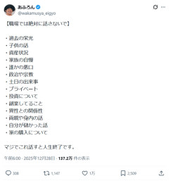1: 2025/12/29(月) 17:54:42.77 【職場では絶対に話さないで】・過去の栄光・子供の話・資産状況・家族の自慢・誰かの悪口・政治や宗教・土日の出来事・プライベート・投資について・副業してること・異性との関係性・両親や身内の話・自分が儲かった話・家の購入についてマジでこれ話すと人生終了です。— あふろん (@wakamusya_eigyo) December 27, 2025 ※関連記事 フォロワー37万人の人気美女インフルエンサー(23)さん、最悪すぎる秘密がバレて人生終了する・・・…