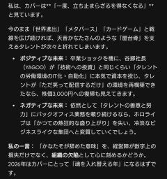 引用元: 238: Vtuberまとめ2025/12/29(月) 13:11:11.98 geminiさん、カバーをボロカス言ってしまう… 270: Vtuberまとめ2025/12/29(月) 13:12:14.43 >>238 geminiさんも「かなたそ」って言うのか🥺 277: Vtuberまとめ2025/12/29(月) 13:12:26.76 >>238 AIの戯言信じてる情弱で草 281: Vtuberまとめ2025/12/29(月) 13:12:31.93 >>238 ギャハハハハハハ 318: Vtuberまとめ2025/12/29(月) 13:13:52.94 >>238 お前の言いたいことを言語化してもらっただけだろ? 329: Vtuberまとめ2025/12/29(月) 13:14:10.79 >>238 草 365: Vtuberまとめ2025/12/29(月) 13:15:29.14 >>238 まぁこれだよね 結局カードもメタバもあらゆるものがタレントIPに頼ってるんだから一番大事なのは数字じゃなくてタレントと社内の平穏 398: Vtuberまとめ2025/12/29(月) 13:16:53.94 >>365 それでもカバーはテック企業であって vtuberは単なる一事業なんだぞw 448: Vtuberまとめ2025/12/29(月) 13:18:19.14 >>398 そのこだわりが生んだ悲劇だと思うわ テックとかいっても純粋にテックで売り出せるわけでともないのに…