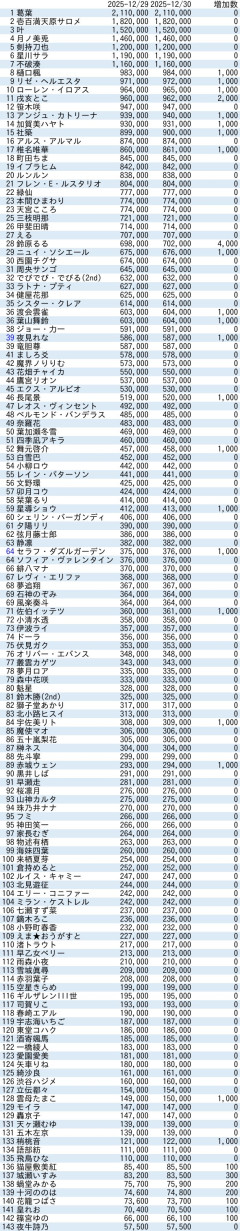 引用元: 1641: Vtuberまとめ 2025/12/30(火) 00:13:07.10 ID:25F0R3t8 るるとまらんな 1678: Vtuberまとめ 2025/12/30(火) 00:14:38.13 ID:dh9MVHb6 >>1641 マイクラ組殆ど伸びてて景気いいな 1686: Vtuberまとめ 2025/12/30(火) 00:15:04.39 ID:mUrilg7F >>1641 90万台の景気が最近いい気がする 1710: Vtuberまとめ 2025/12/30(火) 00:15:49.01 ID:L0klvmFl >>1641 樋口リゼ乳首は来年金盾行きそうな伸びやな 1728: Vtuberまとめ 2025/12/30(火) 00:16:46.44 ID:GdjBQV7p >>1641 樋口リゼ乳首ギリ年内間に合わなかったな 今年度中には金行けそうやな今のペースやと 1730: Vtuberまとめ 2025/12/30(火) 00:16:50.97 ID:6IPcRCpl >>1686 90万いくと登録の伸び加速するイメージがウチにはある 1740: Vtuberまとめ 2025/12/30(火) 00:17:14.34 ID:ReIMdFiW >>1686 👹以上は来年金盾確定か 1808: Vtuberまとめ 2025/12/30(火) 00:19:52.95 ID:ms2LWtyI >>1641 流石に5桁伸びは終わったのか 1845: Vtuberまとめ 2025/12/30(火) 00:21:17.13 ID:25F0R3t8 >>1710 そう言えば今年は金盾いなかったな よ箱ぽ箱も停滞してるしそろそろ箱的に微しくなってるのか 1862: Vtuberまとめ 2025/12/30(火) 00:22:01.02 ID:wY1YHTBG >>1845 代わりに200万が出たから 1873: Vtuberまとめ 2025/12/30(火) 00:22:41.42 ID:RgUiGCiB >>1641 ちょっと待って!えるさん登録こんなあったの!?😲…
