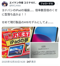 1: 2025/12/30(火) 16:00:29.08 ヨドバシのiPadの福袋、、、倍率数百倍のくせに型落ち品かよ!!せめて現行製品のA16モデルにしてよ、、、、 pic.twitter.com/rxIv31pErN— エイケン作者 コミケ107 二日目 M-22a (@kiri_miso) December 30, 2025 ※関連記事 【画像】ヨドバシの加湿器コーナー、やり過ぎて大変なことになる...…