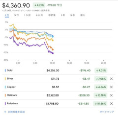 【悲報】ゴールド、シルバー、銅、プラチナ、パラジウム、一斉に大暴落wwwwwwwww