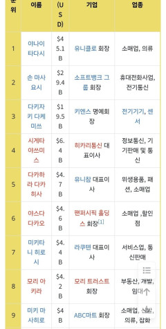 韓国ネットの反応 日本の経済構造の変化が、最新の富豪データから浮き彫りになっています。かつて「メイド・イン・ジャパン」を象徴した自動車や家電メーカーの経営者たちに代わり、現在の日本長者番付の頂点に立つのは、ソフトバンク、ユニクロ、キーエンスといった、ITや独自の流通・高収益モデルを確立した創業者たちです。ソフトバンクの孫正義氏やユニクロ(ファーストリテイリング)の柳井正氏の資産額は、もはや一つの企業の枠を超え、グローバル市場における日本の影響力を象徴する存在となっています。■ 2025年 日本長者番付(トップ10)順位氏名企業名 / 主な業種資産額(推定)1柳井 正 ファーストリテイリング(ユニクロ)約7兆円 ($48.2B)2孫 正義 ソフトバンクグループ約4兆930億円 ($28.2B)3滝崎 武光 キーエンス(センサー・自動化)約3兆円 ($20.7B)4佐治 信忠 サントリーホールディングス約1兆5200億円 ($10.5B)5重田 康光 光通信約1兆円 ($6.9B)6安田 隆夫 パン・パシフィック(ドン・キホーテ)約7840億円 ($5.4B)7高原 豪久 ユニ・チャーム約7690億円 ($5.3B)8関家 一家 ディスコ(半導体製造装置)約7260億円 ($5.0B)9伊藤 兄弟 セブン&アイ・ホールディングス約7110億円 ($4.9B)10森 章森 トラスト(不動産)約6820億円 この記事へのコメントはこちらからお願いします。…