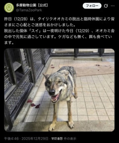 1 : 以下、?ちゃんねるからVIPがお送りします :2025/12/29(月) 17:57:01.354 ID:tWbpyXGU0NIKU.net昨日(12/28)は、タイリクオオカミの脱出と臨時休園により皆さまにご心配とご迷惑をおかけしました。脱出した個体「スイ」は一夜明けた今日(12/29)、オオカミ舎の中で元気に過ごしています。ケガなども無く、餌も食べています。 pic.twitter.com/wI1Docfdq7— 多摩動物公園[公式] (@TamaZooPark) December 29, 2025はぇ……2 : 以下、?ちゃんねるからVIPがお送りします :2025/12/29(月) 17:58:08.004 ID:OyvOVQDm0NIKU.net概ね犬じゃん3 : 以下、?ちゃんねるからVIPがお送りします :2025/12/29(月) 17:58:24.258 ID:2jsjXnAhdNIKU.netかわいい4 : 以下、?ちゃんねるからVIPがお送りします :2025/12/29(月) 17:59:46.424 ID:dC12LznpaNIKU.netオオカミっつーか犬だな5 : 以下、?ちゃんねるからVIPがお送りします :2025/12/29(月) 17:59:59.391 ID:8cbN/1m/0NIKU.netこんな犬一匹に大騒ぎしてたのか転載元スレッド:…