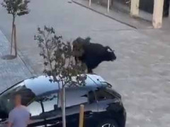 1頭の牛が街中に現れた。道端には車が1台停まっていた → こうなった…