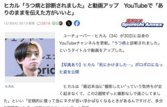 1 : ヒカル「うつ病と診断されました」と告白 YouTubeで「ありのままを伝えた方がいいと」 ユーチューバー・ヒカル(34)が30日に自身のYouTubeチャンネルを更新。「うつ病と診断されました」というタイトルで動画をアップした。 ヒカルは「最近本当に“撮影したい”っていう気持ちが全く起きなくて、この2週間ずっと撮影なしで過ごしてました」といい「定期的に僕って急にネタが思い浮かばなくなるときがあるんですけど、多分2週間空いたのって初めてぐらいかもで」と報告。 「一応知り合いの精神科の先生に今の自分の状態を話したら“無力症候群か、うつ病の一歩手前だね”みたいなことを言われて。自分の中では別にうつ病とかそんな感じは全くないんですけど。定期的に来る波の下の部分がちょっと続いてるだけなのかなっていう感じもします」と赤裸々に語った。全文はソースで 3 : オープン鬱です 7 : まじか。大変そうだもんな…