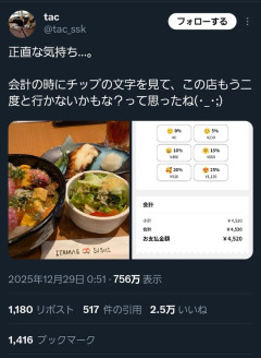 引用元: それでも動く名無し 2025/12/30(火) 03:45:37.06 ID:e1eQzIIY0 X民が叩くということは正解なんか 2: それでも動く名無し 2025/12/30(火) 03:47:40.09 ID:Xkz11oxH0 ワイも飲食店ではないけど某サービス業の店行って「よければチップお願いします」って書いてあったの見て二度と行かへんと思ったわ 54: それでも動く名無し 2025/12/30(火) 04:35:54.28 ID:gf8dCEc70 >>2 よければ がなんかムカつくわ…