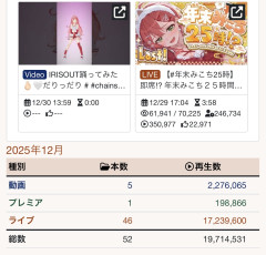 引用元: 454: Vtuberまとめ2025/12/31(水) 01:08:34.46 みこの12月最大値中央値55000(46枠) ぺこらの12月最大値中央値38000(50枠) にも関わらず12月再生数はぺこら>みこ 460: Vtuberまとめ2025/12/31(水) 01:08:47.20 >>454 あ 464: Vtuberまとめ2025/12/31(水) 01:08:54.26 >>454 うおw 477: Vtuberまとめ2025/12/31(水) 01:09:22.49 >>454 配信時間は? 478: Vtuberまとめ2025/12/31(水) 01:09:22.98 >>454 みこやり過ぎだろwww 479: Vtuberまとめ2025/12/31(水) 01:09:25.86 >>454 枠多いなら当たり前では? 483: Vtuberまとめ2025/12/31(水) 01:09:35.15 >>454 盛ってるにぇ 492: Vtuberまとめ2025/12/31(水) 01:09:53.08 >>454 うおw 496: Vtuberまとめ2025/12/31(水) 01:09:59.09 >>454 あ 506: Vtuberまとめ2025/12/31(水) 01:10:18.89 >>454 ぷにち… 509: Vtuberまとめ2025/12/31(水) 01:10:21.43 >>454 25時間配信したのに負けてて草…