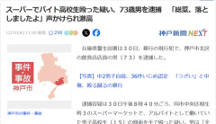 1: 2025/12/31(水) 12:02:02.03 スーパーでバイト高校生殴った疑い、73歳男を逮捕 「総菜、落としましたよ」声かけられ激高 同署によると、買った商品を袋に詰める台のところで、 高校生が床に落ちていた総菜に気付き、そばにいた男に 「これ、落としましたよ」と声をかけたところ、男がいきなり激高したという。 当時男は酒に酔った状態だったという。 ※関連記事 【画像】平成一桁ジジイが小学生の時の切り札がこちらwwwwwwwww…
