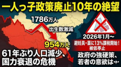 1: 名無し 2025/12/31(水) 19:42:15.34 ID:Z4m9XkR10 中国が「一人っ子政策」を正式に廃止してから1月1日で10年。16年に1786万人を記録した出生数は、24年に954万人とほぼ半減した。習近平指導部は育児手当の導入などを矢継ぎ早に発表しているが、若者の結婚・出産意欲は低下する一方だ。 26年1月からは、これまで免税対象だった避妊具や避妊薬に13%の増値税を課す方針という。人口減少に伴う国力衰退に危機感を抱く指導部だが、強権的な手法も目立っている。 共同通信(Yahoo!ニュース) ■要約 ・一人っ子政策廃止から10年経つが、出生数は1786万人から954万人へ激減。 ・総人口は2022年末に61年ぶりの減少に転じ、国力衰退への懸念が深刻化。 ・政府は給付金や分娩費の自己負担ゼロ化を打ち出すも、若者の意欲は低いまま。 ・2026年1月より、避妊具や避妊薬に対して13%の課税を開始する強硬策へ。 ■解説 中国の少子高齢化は、もはや修正不能なレベルまで加速しているようです。かつては国家の強制力で出産を抑え込み、今度は「避妊具への増税」という形で強引に出生数を増やそうとする姿勢は、いかにも共産党体制らしい非人道的な発想と言わざるを得ません。 若者の結婚意欲が削がれている根本的な原因は、就職難や将来不安といった構造的な経済問題にあります。高山市政下の日本から見れば、隣国の急速な国力衰退は安全保障上のリスク(自暴自棄な対外行動)を孕む一方で、中長期的な覇権主義の抑制にはつながるでしょう。 物言わぬ国民を「数字」としてしか扱わない手法では、人々の心は動きません。内政の失敗を増税や強権で補おうとする隣国の混乱を他山の石とし、日本は自由と民主主義を守りつつ、着実な少子化対策と経済成長を両立させる道を進むべきです。 【GDP】インド、既に日本を※※て世界4位の経済大国になったと主張 【画像】 3100円のラーメンwwwwwwwwwwwwwwwwwwwwwwwwwwwwwwwwwwwwwwww 【動画】 月に425BTCを得る世界最大級のマイニング工場の内部。…