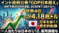 1: 名無し 2025/12/31(水) 19:55:12.48 ID:j7K8m2Nq0 インド政府が年末に公表した経済見通しによると、同国はGDP(国内総生産)で日本を抜いて世界4位の経済大国となった。当局は3年以内にドイツを追い抜いて世界3位となることを期待している。 GDPが4兆1800億ドル(約653兆円)となったインドは、既に日本を抜いて世界4位の経済大国となっており、2030年にはGDPが7兆3000億ドル(約1140兆円)に達すると予測されている。 世界銀行の最新データによると、2024年のインドの一人当たりGDPは2694ドル(約42万円)で、日本の3万2487ドル(約507万円)の12分の1にすぎない。 AFPBB News ■要約 ・インド政府は自国のGDPが4兆1800億ドルに達し、日本を抜いて世界4位になったと公表した。 ・IMFの推計では公式な逆転は2026年(インド4.51兆ドル、日本4.46兆ドル)になると予測されている。 ・インドは今後3年以内にドイツを抜き、2030年には7.3兆ドル規模に成長する見通しを立てている。 ・一方で一人当たりGDPは日本の約12分の1にとどまり、若年層への雇用創出が大きな課題となっている。 ■解説 インドの躍進は目覚ましく、名目GDPでの逆転はもはや時間の問題と言えます。人口ボーナスを背景とした巨大な内需は、高市政権が進める「自由で開かれたインド太平洋」構想においても、中国を牽制するための極めて重要な経済的ピースとなるでしょう。 ただし、数字上の順位に過度に悲観する必要はありません。一人当たりの豊かさでは依然として日本が圧倒しており、私たちが重視すべきは「規模の維持」以上に、高付加価値な産業による「生活の質の担保」です。むしろ、価値観を共有できる民主主義国であるインドが、独裁体制を強める中国を上回る勢いで成長することは、日本の安全保障にとっても歓迎すべき事態です。 今後は「日印経済連携」をさらに深化させ、インドの成長を日本の活力に取り込む戦略が求められます。サプライチェーンの脱中国を進める中で、信頼できるパートナーとしてのインドとの関係強化は、2030年に向けた日本の生き残り戦略そのものと言えるでしょう。 【GDP】インド、既に日本を※※て世界4位の経済大国になったと主張 【画像】 3100円のラーメンwwwwwwwwwwwwwwwwwwwwwwwwwwwwwwwwwwwwwwww 【動画】 月に425BTCを得る世界最大級のマイニング工場の内部。…