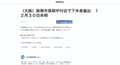 1 : (大阪)阪南市鳥取中付近で下半身露出 12月30日未明 大阪府警によると、30日午前3時40分ごろ、阪南市鳥取中付近で男性による下半身露出が発生しました。(実行者の特徴:長髪、黒色系ミニスカート) ■実行者の言動や状況 ・自分のスカートをめくり、下半身を出しているのが目撃された。 2 : 騙されないぞっ! 3 : また辺鄙な場所で…