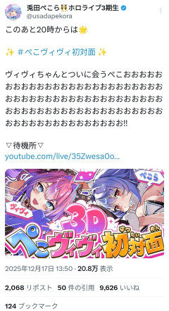【画像】うさだぺこらさん、ついに本日ききららヴィヴィさんと初対面wwwwwwwwwwwwwwwwwwwヴィヴィ久しぶりの2人きりだね…。いったい何が始まるっていうんです?!?!?!それはもうわかってるんじゃないのかい?君のココロに聞いてみなさい。んーっと、えっとぺこヴぃヴぃの仲が深まりますね^^そうだといいですね^^50分から告知もあるみたいですね^^ — 兎田ぺこら👯♀️ホロライブ3期生 (@usadapekora) December 15, 2025 -Vtuberタグ-ホロライブ RSSホロライブ さくらみこ 兎田ぺこら 宝鐘マリン 戌神ころね 星街すいせい 白上フブキ今日のNEW(0゚・∀・)+ ワクテカ +1: 名無しの時事ネタ 2025/12/17(水) 17:05:11.208 ID:XRlTZvRb0…