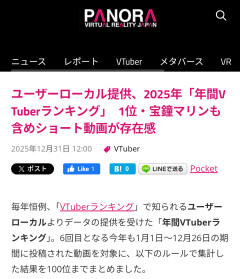 引用元: 217: Vtuberまとめ2026/01/02(金) 07:40:07.04 宝鐘マリンさん圧倒的大差で2025年VTuber年間1位だってよ 277: Vtuberまとめ2026/01/02(金) 07:43:43.07 >>217 総視聴とかいう良くわからないランキングよりこっちの方がシンプルで良い 307: Vtuberまとめ2026/01/02(金) 07:45:33.01 >>217 ショートだけだして後は同期介護が正解だな 397: Vtuberまとめ2026/01/02(金) 07:50:15.03 >>217 星街大した事ない 440: Vtuberまとめ2026/01/02(金) 07:52:34.10 >>217 星街ってマジでオワコンになったよなぁ ビビデバのお陰で有耶無耶だったけど全然じゃん 448: Vtuberまとめ2026/01/02(金) 07:53:16.64 >>307 介護するのが正解とは 459: Vtuberまとめ2026/01/02(金) 07:53:30.19 >>217 ローレンつよ 460: Vtuberまとめ2026/01/02(金) 07:53:31.84 >>440 だからろふまおの剣持に擦り寄ったりして必死になってる 468: Vtuberまとめ2026/01/02(金) 07:53:57.40 >>440 毎年止まらない米津に比べるとマジで存在価値のないカスだよ星街 475: Vtuberまとめ2026/01/02(金) 07:54:24.99 >>460 昔からじゃねえか 494: Vtuberまとめ2026/01/02(金) 07:55:09.96 >>217 ショートで1度も回ってこなかった 506: Vtuberまとめ2026/01/02(金) 07:55:53.67 >>217 なお一昨年投稿のビビデバに再生数負ける模様2025年のオリ曲MV再生数TOP20 5004万 星街すいせい ビビデバ 1888万 宝鐘マリン/こぼ・かなえる III 1789万 星街すいせい Caramel Pain 1379万 宝鐘マリン A Horny Money World ~伝説の夜~ 1370万 がうる・ぐら Ash Again 1328万 こぼ・かなえる HELP!! 1185万 星街すいせい もうどうなってもいいや 1004万 宝鐘マリン スキスキDieスキ超Ayeシテル 912万 宝鐘マリン 美少女無罪♡パイレーツ 855万 森カリオペ LET’S JUST CRASH 765万 星街すいせい Stellar Stellar 761万 星街すいせい ソワレ 756万 Kanaria feat. 星街すいせい レクイエム 728万 星街すいせい 綺麗事 695万 宝鐘マリン パイパイ仮面でどうかしらん? 694万 湊あくあ # あくあ色ぱれっと 632万 轟はじめ Countach 597万 宝鐘マリン I’m Your Treasure Box 572万 宝鐘マリン 幽霊船戦 470万 星街すいせい AWAKE 521: Vtuberまとめ2026/01/02(金) 07:56:43.86 >>506 紅白に出れないビビデバ~😭 562: Vtuberまとめ2026/01/02(金) 07:59:13.09 >>506 いつまで2年も前に出した曲の話してんだよ😥 過去の栄光の話はいいから……