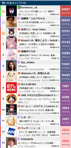 引用元: 312: Vtuberまとめ2026/01/04(日) 06:50:24.65 あっこりゃあああ 342: Vtuberまとめ2026/01/04(日) 06:54:15.34 >>312 りりーか数字でてるな 345: Vtuberまとめ2026/01/04(日) 06:54:34.69 >>312 ホロライブ朝活頑張れよ 348: Vtuberまとめ2026/01/04(日) 06:54:54.20 >>312 コレコレと加藤って男がトップかい 356: Vtuberまとめ2026/01/04(日) 06:55:23.45 >>312 ワンピースまたやってて草 358: Vtuberまとめ2026/01/04(日) 06:55:43.78 >>312 こより頑張ってて草 唯一ホロライブやん 361: Vtuberまとめ2026/01/04(日) 06:55:49.64 >>312 やっぱコレさんか 363: Vtuberまとめ2026/01/04(日) 06:56:11.56 >>358 🐏… 377: Vtuberまとめ2026/01/04(日) 06:57:15.30 >>312 こより頑張ってるな…