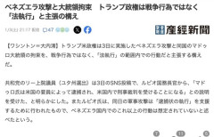 1 : ベネズエラ攻撃と大統領拘束 トランプ政権は戦争行為ではなく「法執行」と主張の構え トランプ米政権は3日に実施したベネズエラ攻撃と同国のマドゥロ大統領の拘束を、戦争行為ではなく、「法執行」の範囲内での行動だと主張する構えだ。 共和党のリー上院議員(ユタ州選出)は3日のSNS投稿で、ルビオ国務長官から、「マドゥロ氏は米国の要員によって逮捕され、米国内で刑事裁判を受けることになる」との説明を受けた、と明らかにした。またルビオ氏は、同日の軍事攻撃は「逮捕状の執行」を支援するために行われたもので、ベネズエラ国内でのこれ以上の行動は想定されていないと述べたという。 5 : 屁理屈…