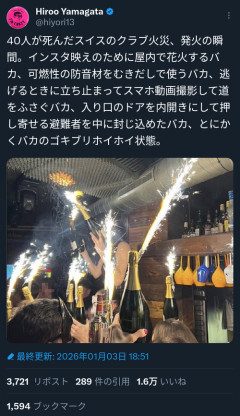 1: 2026/01/04(日) 10:44:42.59 日、スイス南部にあるスキーリゾートのバーで、およそ40人が死亡、115人が負傷した火災の一部始終をおさめた映像火災原因はシャンパンの瓶に差した花火の火が天井に燃え広がったと伝えられていると同時に、映像からは多くの人が炎が広がるなか踊り続けていた事がわかるpic.twitter.com/gwvGtkC7Lq— ミリレポ (@sabatech_pr) January 3, 2026 ※関連記事 【動画】40人死亡のスイス火災、燃え広がる天井を前にスマホで撮影大会→避難せず大惨事…