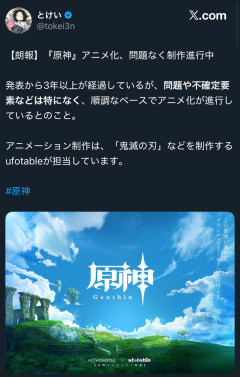 【朗報】ufotable制作のアニメ「原神」、全シリーズアニメ化wwwwwwww