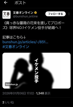 1: 名無しさん 2026/01/06(火) 17:28:37.817 ID:.702WhCyN 3: 名無しさん 2026/01/06(火) 17:29:15.955 ID:.702WhCyN シーズンオフのプロ野球界は結婚ラッシュだ。昨年12月にも、中日の岡林勇希外野手(23)や広島の中村奨成外野手(26)など、結婚発表が相次いだ。そんな中、あの“球界NO.1イケメン投手”も結婚を決意したことが「週刊文春」の取材で分かった。【画像】若手選手に結婚発表が相次いでいる「昨年12月、ディズニーランドのホテルミラコスタで真っ赤な薔薇の花束を渡し、プロポーズ。無事に成功したそうです」(球団関係者) ロマンチックな求婚を成功させたのは、甘いマスクとモデル並のスタイル、愛嬌のあるキャラクターで女性ファンたちを虜にしてきたイケメン投手だ。女性ファンによる人気投票で1位に輝いたこともある。 果たして、その正体は。そして、そんな彼を射止めた女性はどのような人物なのか。その詳細については、現在配信中の 「週刊文春 電子版」 で読むことができる。…