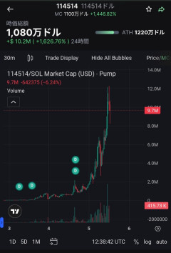 1 : 114514コインが11日で時価総額10億円に急成長 開発者のゲームアプリ制作者かえでゲームズ氏が手がけ、専用トラッカーアプリがApp Store金融ランキングでSBI証券アプリを抜く94位に。 1月3日頃からXでチャート画像が広がり、数日で2000倍超の高騰を見せ、5万円投資で億り人や3000万円超の利益報告が相次いだ。 3 : どうせ売れないし 4 : ミームは基本利確現金化出来ない時点でゴミやん…