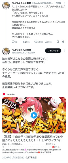 引用元: 4: Vtuberまとめ2026/01/08(木) 07:40:21.04 なんか表でまた燃えそうなネタ来てるけど 該当箇所はこちらの動画の51:45です。音飛びと映像カットが確認できます。 さくらみこ氏の声明前ではなく、モデレーターには指示をしていないと声明を出した後の編集。 前後関係が逆ならまだ救いがありましたが、正直擁護しようがないです。 — つよつよくん@南関 (@RxcdvLU8OY33200) January 7, 2026 8: Vtuberまとめ2026/01/08(木) 07:40:36.16 >>4 あ 11: Vtuberまとめ2026/01/08(木) 07:40:42.61 >>4 あ 13: Vtuberまとめ2026/01/08(木) 07:40:57.06 >>4 あ 17: Vtuberまとめ2026/01/08(木) 07:41:08.86 >>4 起きたらなんか燃料追加されてて草 20: Vtuberまとめ2026/01/08(木) 07:41:13.90 >>4 !? 21: Vtuberまとめ2026/01/08(木) 07:41:18.23 >>4 声明後の証拠は無いけど 23: Vtuberまとめ2026/01/08(木) 07:41:20.88 >>4 なーにやってんだ 27: Vtuberまとめ2026/01/08(木) 07:41:38.89 >>4 なんでいつ編集したか知ってるんだ? 無断で切り取ったモデレーター本人? 28: Vtuberまとめ2026/01/08(木) 07:41:40.54 >>4 えぇ… 29: Vtuberまとめ2026/01/08(木) 07:41:48.25 >>4 どんどん出てくるな 34: Vtuberまとめ2026/01/08(木) 07:42:00.13 >>27 あ 35: Vtuberまとめ2026/01/08(木) 07:42:02.49 >>4 草 もう完全に虫眼鏡で見られる枠やんなぁ 35Pおめでとう 41: Vtuberまとめ2026/01/08(木) 07:42:13.12 >>27 一昨日には編集されてたからね 43: Vtuberまとめ2026/01/08(木) 07:42:20.55 >>4 もう終わりましたよこの話 52: Vtuberまとめ2026/01/08(木) 07:42:46.78 >>4 これもっと皆知らないとな… 都合の悪い事ばかりデリートする→揉み消すやり方嫌いやわ 54: Vtuberまとめ2026/01/08(木) 07:42:49.79 >>4 これもホロ運営がクソなせいじゃん 60: Vtuberまとめ2026/01/08(木) 07:43:07.15 >>4 カバーってバカーなの? マジで運営アホじゃん 62: Vtuberまとめ2026/01/08(木) 07:43:15.41 >>4 ( ・᷄ᯅ・᷅ )あの…モデレーターが勝手にやりました…