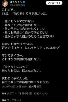 1 : 以下、?ちゃんねるからVIPがお送りします :2026/01/06(火) 20:50:59.475 ID:f/XXtGD60.netこれガチ。58歳、「独り身」でマジ良かった。・誰にもジャマされない・誰からも文句を言われない・誰の予定にも合わせなくていい・誰にも遠慮なく自分で決めていい・誰かじゃなく自分のために生きていい自虐でも強がりでもなく好きで「ひとり」になったワケじゃないけどマジでサイコー。こればかりは誰にも譲れない。「ひとり」になって失ったものは、ほとんどない。代わりに手に入った自由と楽しさの破壊力がエグすぎた。転載元スレッド:…