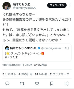 ◇ 1: 名無し 2026/01/08(木) 01:42:25.89 ID:2uqgqsSd0 関連記事声優の楠木ともりさん、結婚を発表「学生の頃からお付き合いしている方と」 ◇ 2: 名無し 2026/01/08(木) 01:43:01.95 ID:7eA+9MSj0 草 まあアイドル売りしてたからしゃーない ◇ 5: 名無し 2026/01/08(木) 01:45:13.82 ID:4zIkre7a0 誤解てなんやねん…