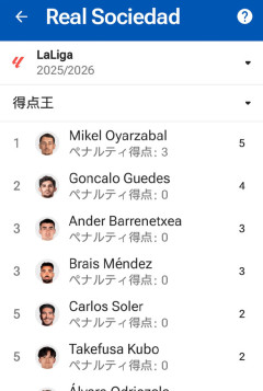 702: 名無しに人権はない@実況OK 2026/01/08(木) 21:14:09.44 ID:0o+KXs8nソシエダチーム内の得点ランキング上位5人あと降格圏近い場合は次の対戦相手との戦い方を決める為に勝ち点がどの程度必要かを考えるのは常識で、アトレティコ戦については最低でも勝ち点1が必要だったのでノルマは達成したもののジローナがマジョルカに勝った為に勝ち点18で3チームが並ぶ団子レース中w次節ヘタフェ戦バルサ戦セルタ戦で3連勝はどうやっても無理なのであまり偏った事は書かない方が良いというのも常識レベルなので自重して欲しいw毎日ここを荒らされるのも単純迷惑なのでそういう事も少しぐらいは考えて欲しいなw…