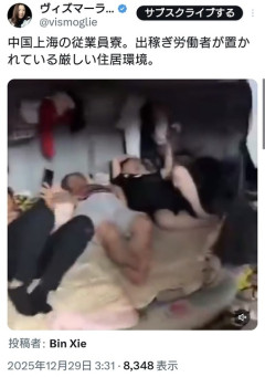 1: ジャンピングパワーボム(東京都) [US] 2026/01/08(木) 17:43:17.85 ID:YC/oVI3d0● BE:662593167-2BP(2000) sssp://img.5ch.net/ico/taxi.gif 2: ジャンピングパワーボム(東京都) [US] 2026/01/08(木) 17:43:31.09 ID:YC/oVI3d0 BE:662593167-2BP(1000) sssp://img.5ch.net/ico/taxi.gif 引用元: ・ スポンサーリンク スポンサーリンク 3: TEKKAMAKI(みかか) [TR] 2026/01/08(木) 17:44:30.94 ID:dy7yVQLh0 チャイニーズ蛸部屋 4: 逆落とし(愛知県) [US] 2026/01/08(木) 17:46:58.59 ID:sbmhiwr50 臭そう 5: アンクルホールド(ジパング) [ニダ] 2026/01/08(木) 17:48:37.84 ID:Jlt+ZhQD0 10年前の時点で地下に数畳で何十人も住んでる蟻族?ネズミ族が問題なってて 今は地下すら家賃高くて住めなくて路上で寝てる 6: 河津掛け(庭) [US] 2026/01/08(木) 17:50:04.03 ID:mBA7X40C0 アフリカの刑務所かと思ったわ 7: 中年'sリフト(東京都) [DE] 2026/01/08(木) 17:50:49.64 ID:vR5mep9f0 ここからどうやって増税に持って行くかが自民党員の腕の見せ所 9: アルゼンチンバックブリーカー(庭) [KR] 2026/01/08(木) 17:52:25.45 ID:MsT4FfE80 こういうのと金融操作で低価格を維持しているわけだ 10: TEKKAMAKI(庭) [US] 2026/01/08(木) 17:53:01.95 ID:tFW1Okuw0 日本の日雇い土工の飯場より酷くて草 11: シャイニングウィザード(新日本) [US] 2026/01/08(木) 17:53:42.12 ID:QAfhsxDE0 奴ら一流大学出ても配達員の仕事しかないからな 12: 頭突き(やわらか銀行) [MX] 2026/01/08(木) 17:54:30.00 ID:FnPhs0f70 こういう国民が不満を爆発させないよう日本や台湾、アメリカに向けるのが中国共産党は本当に上手 13: エメラルドフロウジョン(やわらか銀行) [CN] 2026/01/08(木) 17:56:20.10 ID:K97AiOIB0 個室ですらないのか 14: ファルコンアロー(庭) [EG] 2026/01/08(木) 17:56:20.24 ID:qdMTEvfh0 洗濯はしてるぽいけど風呂にも入ってんの? 15: 逆落とし(やわらか銀行) [US] 2026/01/08(木) 17:58:30.43 ID:IgzDBad/0 寮完備、楽しい職場です。ぐふっw 16: パイルドライバー(庭) [CN] 2026/01/08(木) 17:59:36.68 ID:QPlfhgqV0 たいしたもんだ 17: テキサスクローバーホールド(東京都) [TW] 2026/01/08(木) 18:04:00.31 ID:x1ohrzJ90 トヨタの期間工か 18: 張り手(東京都) [ニダ] 2026/01/08(木) 18:05:44.33 ID:DZxX7Y2X0 直ぐ潜水艦乗りなれそうやな 規律さえ守れれば精神的には大丈夫そうw 19: スリーパーホールド(兵庫県) [TW] 2026/01/08(木) 18:08:50.55 ID:FFv7FC7i0 南京虫だらけ 20: 足4の字固め(やわらか銀行) [RU] 2026/01/08(木) 18:09:31.05 ID:IrGBc5aE0 インフルエンザとか流行すれば漏れなく感染だな 21: クロイツラス(茸) [TW] 2026/01/08(木) 18:15:36.71 ID:DZV4212d0 自衛隊の長期演習とか災害派遣だとそんな感じになるな。30年以上前の話だけど 22: アンクルホールド(ジパング) [US] 2026/01/08(木) 18:17:47.97 ID:6VwpKKQb0 まぁ橋の下で寝るよりは良いが、鶏舎みたいな環境だな 23: ファイナルカット(福岡県) [ZM] 2026/01/08(木) 18:18:53.95 ID:rgMxSw7O0 バッキー汚部屋 24: ファルコンアロー(ジパング) [US] 2026/01/08(木) 18:27:46.29 ID:5huGJsVL0 これでも仕事があるだけマシだからなあ 若者の失業率ほぼ50%だし スポンサーリンク スポンサーリンク スポンサーリンク…