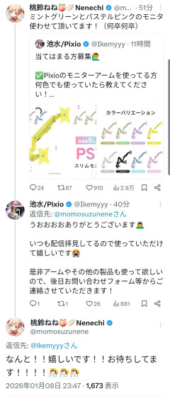 引用元: 1713: Vtuberまとめ (ワッチョイW d58e-fpGC) 2026/01/09(金) 00:24:00.28 ID:PhCNo5mm ねねち、案件獲得しました 1729: Vtuberまとめ (ワッチョイW 4da2-uhxQ) 2026/01/09(金) 00:24:54.28 ID:KzoSH6DJ >>1713 すげーな、ダイレクト受注だなw 1731: Vtuberまとめ (ワッチョイ c065-Zs27) 2026/01/09(金) 00:25:11.11 ID:fIvxPsfB >>1713 流石に草 1733: Vtuberまとめ (ワッチョイW b22b-pUVe) 2026/01/09(金) 00:25:30.38 ID:baMVV9o6 >>1713 っぱねねちなんだよね 1740: Vtuberまとめ (ワッチョイ c065-y8Pp) 2026/01/09(金) 00:26:16.78 ID:sJ638Tve >>1713 なんだこのライブ感 1753: Vtuberまとめ (ワッチョイW a6f9-8Jcr) 2026/01/09(金) 00:27:16.45 ID:s8yIIxuE >>1713 15分で案件まとまった 1765: Vtuberまとめ (ワッチョイW 838e-oq3C) 2026/01/09(金) 00:28:07.75 ID:OCkLqExd >>1713 すげぇフッ軽過ぎるwww 1768: Vtuberまとめ (ワッチョイ 9331-y8Pp) 2026/01/09(金) 00:28:20.95 ID:gLPjKn17 >>1713 営業のホロ 1775: Vtuberまとめ (ワッチョイW 725b-aCiF) 2026/01/09(金) 00:28:43.13 ID:1TKFcOR7 >>1713 女子のモニターアームって大体これだよな 1776: Vtuberまとめ (ワッチョイW c016-Iv7D) 2026/01/09(金) 00:28:47.26 ID:9oNU124h >>1713 これってノーギャラだよな? 1777: Vtuberまとめ (ワッチョイW 39f9-w1uO) 2026/01/09(金) 00:28:50.47 ID:9usUBSoT >>1713 つよすぎる 1781: Vtuberまとめ (ワッチョイW 952d-VD1j) 2026/01/09(金) 00:29:23.78 ID:Ry1ONkah >>1713 実際に依頼したらカバー営業が高額を提示して手を引いたりせんのかな ホロメンの1時間の拘束とかでどれくらいかかるか分からんが 1979: Vtuberまとめ (ワッチョイW f865-Woqu) 2026/01/09(金) 00:47:52.59 ID:lFQaYVKe >>1713 これでサラリーマンの年収分はゲット お前らが2026年働く分の金を稼いだ 世の中おかしいよ😭…