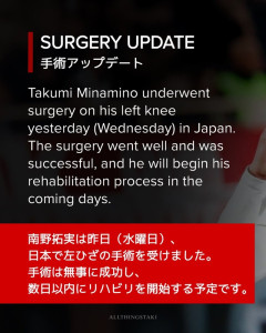 428: 名無しに人種はない@実況OK 2026/01/09(金) 00:31:45.75 ID:8xlLxGVE0 AllTsタキ @AllThingsTaki (2026/01/09 00:21:12) 🏥 INJURY UPDATE 南野拓実の膝の手術は無事に成功しました Takumi Minamino undergoes successful knee surgery. 🗞 AS Monaco, L'Equipe, Nice Matin 引用元:…