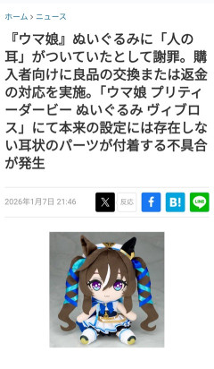 【恐怖】ウマ娘のぬいぐるみに人の耳が付いているのが発見され公式が謝罪と回収返金へ…