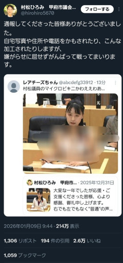 1: 2026/01/10(土) 00:36:39.29 通報してくださった皆様ありがとうございました。自宅写真や住所や電話をかもされたり、こんな加工されたりしますが、嫌がらせに屈せずがんばって戦ってまいります。 pic.twitter.com/x0WlMmLqlh— 村松ひろみ 甲府市議会議員 (@hirohiro5670) January 9, 2026 ※関連記事 【悲報】 X、Grokの「あらゆる女性をビキニ姿にする」機能地獄絵図と化す…