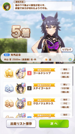 355: 名無しのトレーナー 26/01/09(金) 22:07:24 ID:MQ.8e.L64 ルムマサンガツ体力ないなったとかうっせやろスタ1800のエネルギッシュとぬかりなしあるんやで 358: 名無しのトレーナー 26/01/09(金) 22:07:45 ID:p1.kx.L59 みどりの言葉は信じるな 359: 名無しのトレーナー 26/01/09(金) 22:07:53 ID:Vt.kx.L66 ブライアンちゃんは抜かりなし持ってるけど信用してない 362: 名無しのトレーナー 26/01/09(金) 22:08:12 ID:6R.wx.L46 たづなは弱いウマの気持ちが分からんからな 365: 名無しのトレーナー 26/01/09(金) 22:08:25 ID:bC.z1.L27 ワイのオグリもかかってもないのにたまに温存出るわ先行はやっぱ消耗激しいことあるわね 367: 名無しのトレーナー 26/01/09(金) 22:08:42 ID:sU.ex.L34 ワイもさっき普通に持久力温存出てたな 370: 名無しのトレーナー 26/01/09(金) 22:09:34 ID:bC.z1.L27 割と絶好調固定多い野良ルムマでこれだから本番のランダムではけっこう温存出そうやなあ 372: 名無しのトレーナー 26/01/09(金) 22:10:02 ID:aq.ex.L11 もしかして有馬って金回復欲しいんじゃねえか? 373: 名無しのトレーナー 26/01/09(金) 22:10:19 ID:tN.ss.L17 しゃあっ神速 374: 名無しのトレーナー 26/01/09(金) 22:10:21 ID:oI.9l.L83 なぁに本番は相手もスタ足りねぇよ 375: 名無しのトレーナー 26/01/09(金) 22:10:25 ID:Z6.gz.L92 (ワンチャンスタミナグリード全員に積めばいけるか?) 377: 名無しのトレーナー 26/01/09(金) 22:10:39 ID:6R.wx.L46 アグレッシブとか積んでるのが悪い 379: 名無しのトレーナー 26/01/09(金) 22:10:58 ID:MQ.8e.L64 意外と回復はエネルギッシュ以外にも一つか二つ積んでおいてもええかも知れんな 384: 名無しのトレーナー 26/01/09(金) 22:13:44 ID:vg.gz.L54 たづなの言葉を信じるな 385: 名無しのトレーナー 26/01/09(金) 22:14:29 ID:ku.wx.L28 初期にたづな信じて手探りなステータス作ってた時期懐かしい加速の概念もなかったし 393: 名無しのトレーナー 26/01/09(金) 22:15:58 ID:Q3.ks.L42 自前金回復あるマックちゃんならスタミナ1600くらいに抑えて他のステータスに回した方がええんかなぁ 395: 名無しのトレーナー 26/01/09(金) 22:16:37 ID:aq.ex.L11 スタミナ勝負を無礼るなよ 引用元: 【おんJ】ウマ娘 プリティーダービー部 第12054レース…