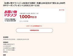 楽天お買い物マラソン、1.3万円以上で使える1000円オフクーポン配布中 10日20時から利用可能