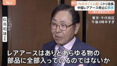 1:名無しさん@おーぷん 26/01/08(木) 13:52:27 ID:PwMk ニトリHD 似鳥昭雄 会長「レアアースはありとあらゆる物の部品に全部入っているのではないか。こういう携帯なんかも含めて。ものすごく心配している」日中の経済団体による祝賀会で、「ニトリホールディングス」の似鳥昭雄会長は「レアアースは自社の冷蔵庫やテレビ、洗濯機などにも使われている」として、供給停止の可能性に懸念を示しました。そのうえで、日本政府に対して「早く手を打ってほしい」と述べました。…