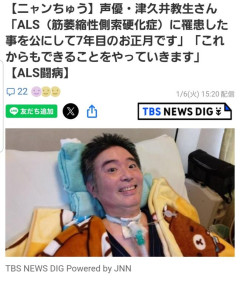 1: 名無しのアニゲーさん 2026/01/09(金) 19:13:39.941 ID:Y0NNJDoAx NHK『ニャンちゅうワールド放送局』の「ニャンちゅう」役などで知られ、現在ALS(筋萎縮性側索硬化症)で闘病中の声優・津久井教生さんが5日、自身のブログを更新。通常の日常に戻ったことを報告しました。 津久井さんは「今日から通常の日常です、前に進んでいきます」と題してブログを投稿。介護の体制も通常に戻ったことを報告しました。久しぶりに訪問入浴も行えたそうで、「1週間ぶりの訪問入浴の丸洗いは気持ちいい~~のです いつもより念入りに洗ってもらいました」と綴っています。津久井さんは「これからまた看護師の方やリハビリの方の訪問が始まるので心強いです」「そして年末年始も訪問してくれたヘルパーさんに感謝しています」「なによりも一番不休の妻に大感謝です こうやって支えられて生きています…」と、改めて日々支えてくれている周囲の人々に感謝の気持ちを述べています。津久井さんは「ALS(筋萎縮性側索硬化症)に罹患した事を公にして7年目のお正月です」「7年ってすごいなぁ~と思います 3年目の危篤状態からも4年目です…」と自身の闘病生活を振り返ります。そして「これからもできることをやっていきます 先を見越して工夫していきます」と宣言。続けて、「そのために皆の支えに頼らせてもらいます 皆、健康で過ごせますように」と願いを込めました。津久井さんは、ALS公表から5年が経過した2024年10月のブログで、「病状の進行の早さからすると 5年も生きていてすごいと思います。家族と介護に携わってくださった皆さんに感謝です」と、周囲への深い感謝を投稿。続けて、「病気はいきなり目の前に現れるのです! どうか皆さん、日頃の健康チェックを大事にしてください」とファンへ健康管理を呼びかけていました。…