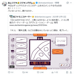 引用元: 1098: Vtuberまとめ (ワッチョイ 83e5-U1wP) 2026/01/11(日) 19:41:15.04 ID:IkZui7k0 大神ミオ🌲ホロライブゲーマーズ🐺 @ookamimio (2026/01/11 19:41:06) 21時から、フブキのチャンネルで フブミオぺこトワちは の5人でコラボだよ〜三┏( ^o^)┛ 21時から、フブキのチャンネルで フブミオぺこトワちは の5人でコラボだよ~三┏( ^o^)┛ — 大神ミオ🌲ホロライブゲーマーズ🐺 (@ookamimio) January 11, 2026 1120: Vtuberまとめ (ワッチョイ eae5-xsxN) 2026/01/11(日) 19:41:36.44 ID:QsQIR4yV >>1098 🥰 1125: Vtuberまとめ (ワッチョイ c065-NCSa) 2026/01/11(日) 19:41:42.49 ID:roaMKf0Q >>1098 ぺこ!? 1133: Vtuberまとめ (ワッチョイW df22-WwU0) 2026/01/11(日) 19:41:57.39 ID:idumPHa8 >>1098 ぺっさんくるのか 1135: Vtuberまとめ (ワッチョイW 66a2-74XL) 2026/01/11(日) 19:41:59.88 ID:LQRf13Au >>1098 ぺこ!? 1137: Vtuberまとめ (ワッチョイW d55b-XkGQ) 2026/01/11(日) 19:42:06.41 ID:dOphIkTe >>1098 ぺこ!? 1139: Vtuberまとめ (ワッチョイW 9516-ClST) 2026/01/11(日) 19:42:09.30 ID:onF5tHrX >>1098 なにぃ!? 1144: Vtuberまとめ (ワッチョイ 3978-7ziM) 2026/01/11(日) 19:42:26.69 ID:5ukpnhiC >>1098 ちゃま事変以降辺りからパティメンのぺこちゃんキャリー盛んだな 1145: Vtuberまとめ (ワッチョイ 87ad-xsxN) 2026/01/11(日) 19:42:27.94 ID:gZdAShAr >>1098 ぺこ!? 1147: Vtuberまとめ (ワッチョイ fe1a-zALL) 2026/01/11(日) 19:42:31.86 ID:4MLrEtSI >>1098 何すんの 1148: Vtuberまとめ (ワッチョイW 3907-PMDY) 2026/01/11(日) 19:42:32.54 ID:MxELsEKc >>1098 なんかぺこらおって草 1150: Vtuberまとめ (ワッチョイW f865-ebMq) 2026/01/11(日) 19:42:34.58 ID:A7UwfzUQ >>1098 ぺこ!? 1151: Vtuberまとめ (ワッチョイW 39f9-w1uO) 2026/01/11(日) 19:42:39.79 ID:Is1DEmT1 >>1098 UNDERWARDかREPOか 1154: Vtuberまとめ (ワッチョイW 958f-NHau) 2026/01/11(日) 19:42:43.64 ID:cRE2Mz3o >>1098 ? 1160: Vtuberまとめ (ワッチョイ 935b-MCom) 2026/01/11(日) 19:42:57.56 ID:k2VSmKo9 >>1098 ぺっこりゃ 1162: Vtuberまとめ (ワッチョイW 87d3-vnuX) 2026/01/11(日) 19:42:59.24 ID:3oMYZ4tQ >>1098 また派閥か 1168: Vtuberまとめ (ワッチョイW 725b-aCiF) 2026/01/11(日) 19:43:10.22 ID:J5Sem8ym >>1098 ぺこら枠じゃないの? 1170: Vtuberまとめ (ワッチョイW 1e43-VP2b) 2026/01/11(日) 19:43:16.83 ID:Q0oSHfZZ >>1098 ついにぺこーらも派閥入りか 1171: Vtuberまとめ (ワッチョイW 878e-RAJr) 2026/01/11(日) 19:43:20.38 ID:AIJXYaP3 >>1098 ぺこ!? 1175: Vtuberまとめ (ワッチョイW 3907-zFGx) 2026/01/11(日) 19:43:26.83 ID:5I7pvCZa >>1098 ぺこぉ!? 1178: Vtuberまとめ (ワッチョイW 34f9-rX3Y) 2026/01/11(日) 19:43:30.71 ID:bcMQeAfE >>1098 みことぺこ間違えた? 1184: Vtuberまとめ (ワッチョイ d165-xsxN) 2026/01/11(日) 19:43:48.92 ID:FER5qW2O >>1170 ″偏り″な 1189: Vtuberまとめ (ワッチョイ fe1a-zALL) 2026/01/11(日) 19:43:58.37 ID:4MLrEtSI >>1151 これらしいわ 1190: Vtuberまとめ (ワッチョイW 0bcd-CejK) 2026/01/11(日) 19:43:59.50 ID:Kt3Y7izk >>1151 白上フブキ🌽フブキングダム👑 @shirakamifubuki (2026/01/11 18:01:27) 今日はずっとやりたかったこのゲームをホロメンとやるぞぉおおお!!!!!! バレないように…描けるのか… 今日はずっとやりたかったこのゲームをホロメンとやるぞぉおおお!!!!!!バレないように…描けるのか… — 白上フブキ🌽フブキングダム👑 (@shirakamifubuki) January 11, 2026 [引用元] 電ファミニコゲーマー @denfaminicogame (2025/12/12 17:57:03) 「AIには分からないけど、人間には分かる」ように絵を描く、2~6人用協力パーティーゲーム『デヴィエーション・ゲーム』発売 「ネコ」「資本主義」などのお題をAIにバレないよう描き、他プレイヤーに当ててもらう。ひとりが購入すれば、他メンバーはスマホから無料で遊べる 1192: Vtuberまとめ (ワッチョイ d55b-aVqD) 2026/01/11(日) 19:44:02.69 ID:7guWJKLH >>1162 派閥か? 1197: Vtuberまとめ (ワッチョイW f865-ebMq) 2026/01/11(日) 19:44:22.44 ID:A7UwfzUQ >>1162 ガイジ 1206: Vtuberまとめ (ワッチョイ d19d-CdcC) 2026/01/11(日) 19:44:45.26 ID:STFXKFoM >>1098 ぺこーらどりゃああああああああああああああ 1211: Vtuberまとめ (ワッチョイ 57e5-CdcC) 2026/01/11(日) 19:44:59.56 ID:BRSH3E3Y >>1098 ぺこ!? 1214: Vtuberまとめ (ワッチョイW 39f9-w1uO) 2026/01/11(日) 19:45:02.57 ID:Is1DEmT1 >>1189 GarticPhoneにちょっとPvE要素入ったみたいな感じか 1219: Vtuberまとめ (ワッチョイ 95af-UU4V) 2026/01/11(日) 19:45:11.24 ID:ep8AUPo1 >>1098 あと1人枠が空いてる、この意味が分かるか?ぺこみこ待機 1220: Vtuberまとめ (ワッチョイ 3940-0hAJ) 2026/01/11(日) 19:45:14.46 ID:AiafCLkN >>1190 これ見たかったわ 1221: Vtuberまとめ (ワッチョイW 725b-DFdd) 2026/01/11(日) 19:45:14.68 ID:Qo6SnwhY >>1098 派閥ガイジどうすんのこれ 1240: Vtuberまとめ (ワッチョイ d59b-zALL) 2026/01/11(日) 19:45:33.78 ID:gAA1qJPy >>1221 ミオがいるから派閥だけど 1244: Vtuberまとめ (ワッチョイW 725b-NHau) 2026/01/11(日) 19:45:41.44 ID:PdE7JZHV >>1098 さくらみこ切られててワロタぁ!!!! 1246: Vtuberまとめ (ワッチョイW 399d-qwln) 2026/01/11(日) 19:45:42.78 ID:266qxdAN >>1189 クソ面白そうやんけ 1252: Vtuberまとめ (ワッチョイ f865-UU4V) 2026/01/11(日) 19:46:02.50 ID:6NSp92Mx >>1144 逆だろ 1256: Vtuberまとめ (ワッチョイW df5f-Iv7D) 2026/01/11(日) 19:46:07.85 ID:juz94N9Z >>1098 ぺこたやどりゃああああああああああああああああ😍 1260: Vtuberまとめ (ワッチョイ 3978-7ziM) 2026/01/11(日) 19:46:14.33 ID:5ukpnhiC >>1244 そこの繋がり切れると途端に孤立した